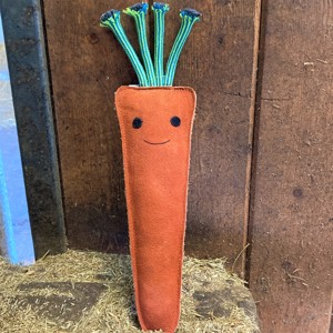 Słodka zabawka dla koni w kształcie marchewki.