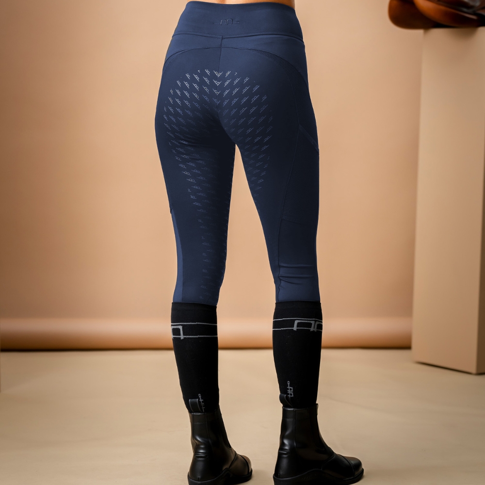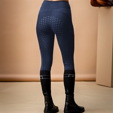 Wysoki stan i korzystne szwy zapewniają piękną sylwetkę i gwarantują, że legginsy zachowują swój kształt – nawet po wielokrotnym użyciu. Silikonowy full seat-grip zapewnia dodatkową stabilność i bezpieczeństwo w siodle, podczas gdy panele z siatki na udach i perforacja przy dolnej części nogawek zapewniają skuteczną wentylację. Bezszwowa wewnętrzna strona nogawki zwiększa komfort, zwłaszcza podczas długich jazd i przy użyciu wysokich butów jeździeckich.