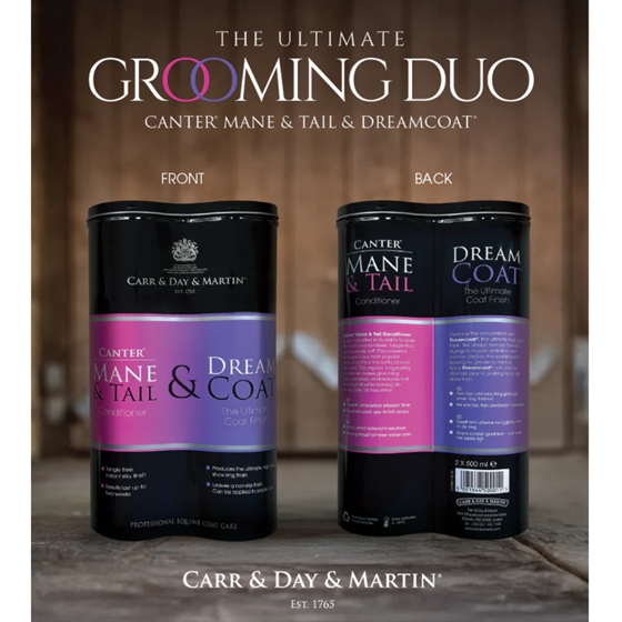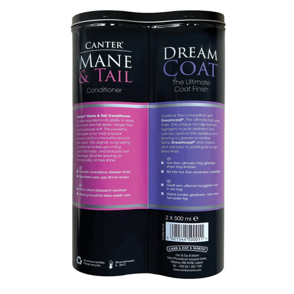 Med CANTER® Mane & Tail og DREAMCOAT® efterlades hesten silkeblød, glansfuld og velplejet fra hoved til hale. Produkterne giver et professionelt finish og en frisk, behagelig duft, der fuldender det perfekte udtryk.
