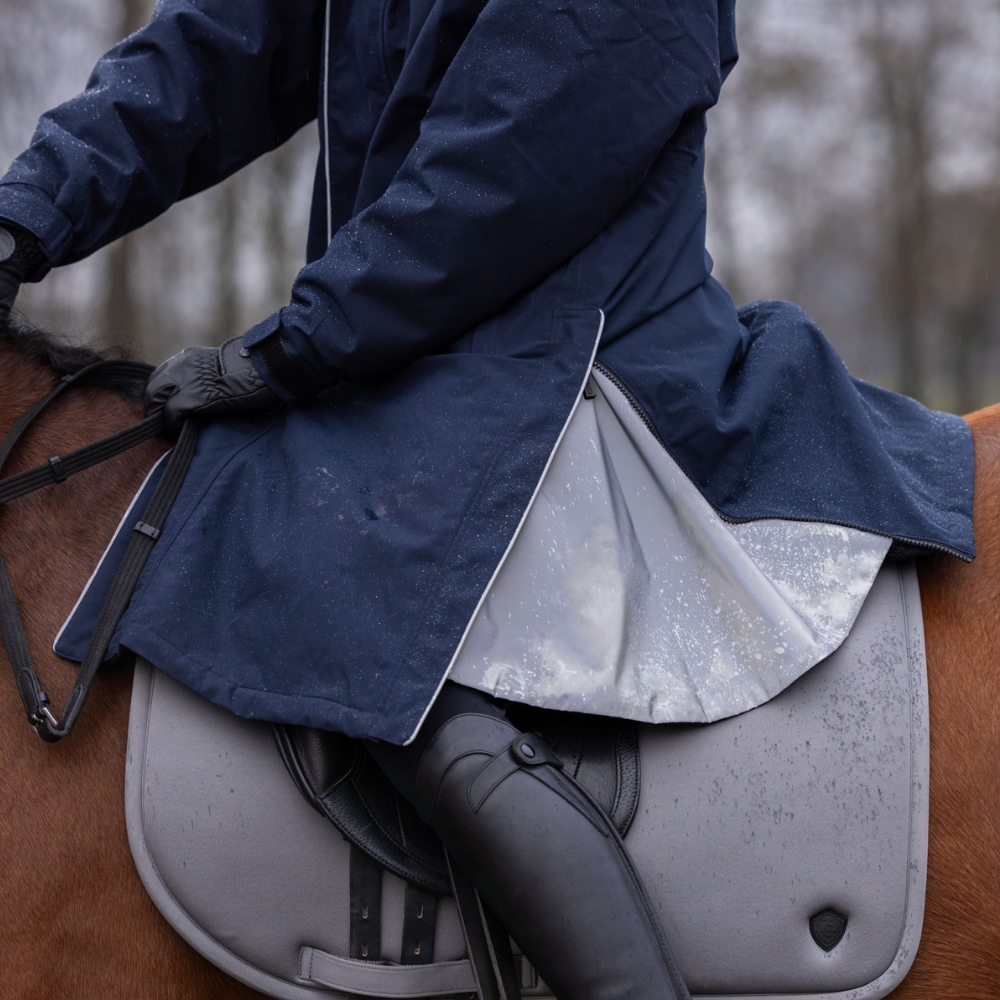 Ten płaszcz jeździecki w oversize to idealny wybór na zimne i mokre dni w stajni lub na ujeżdżalni. Łączy maksymalne ciepło i komfort z praktycznymi detalami, co czyni go idealnym do aktywnego użytkowania – niezależnie od pogody.