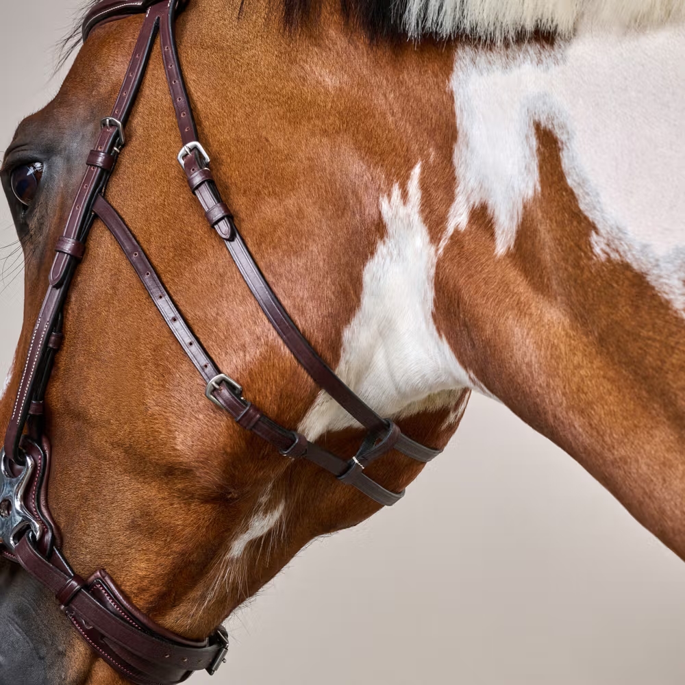 Części policzkowe Hackamore z regulowanym paskiem pod szczęką, aby utrzymać je na miejscu.