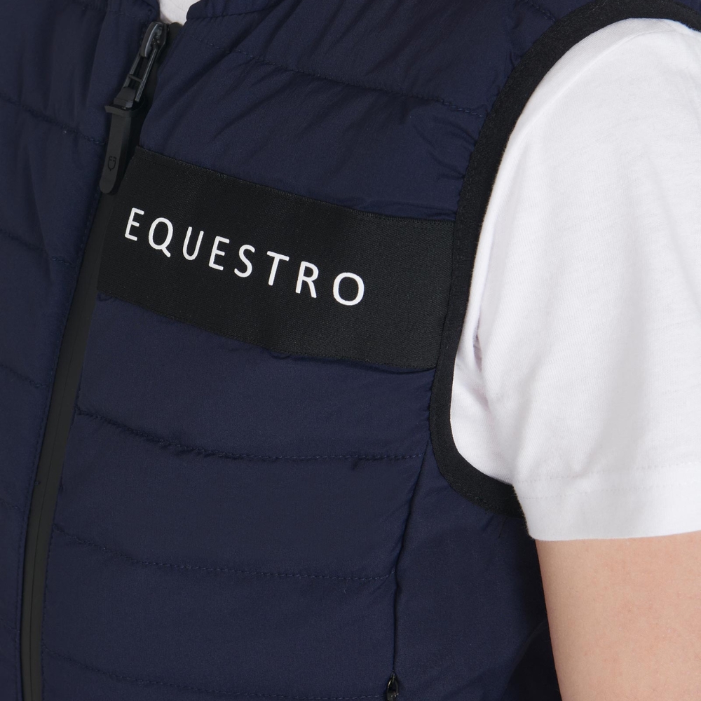Kamizelka posiada zapięcie na zamek z ochroną przed wiatrem, dwie praktyczne kieszenie boczne na zamek oraz eleganckie logo Equestro nadrukowane na lewej piersi.