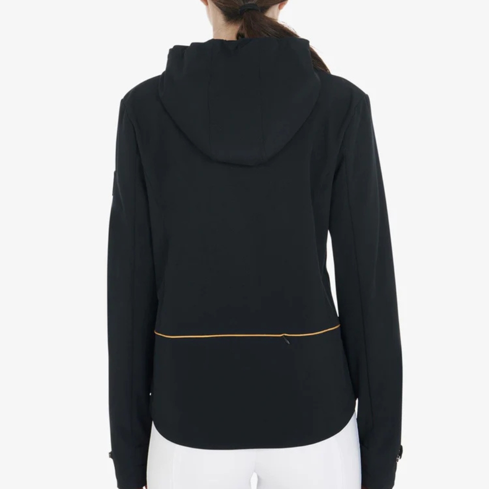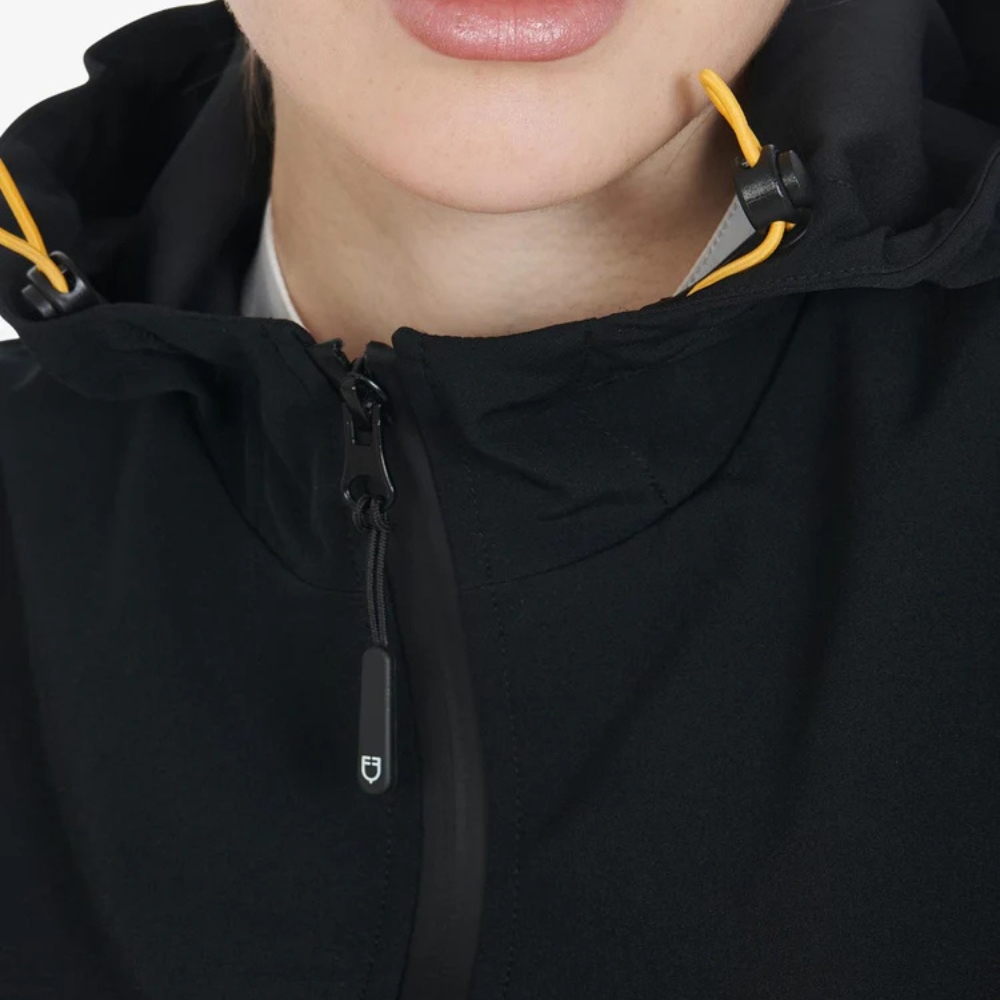 Dzięki regulowanemu kapturowi i talii kurtka łatwo dopasowuje się do kształtu ciała, a guziki przy nadgarstkach umożliwiają regulację długości rękawów. Praktyczny dwukierunkowy zamek błyskawiczny zapewnia dodatkową swobodę ruchów i optymalny komfort, zarówno w siodle, jak i poza nim. Ukryte kieszenie z zamkiem błyskawicznym z przodu zapewniają bezpieczne przechowywanie rzeczy.