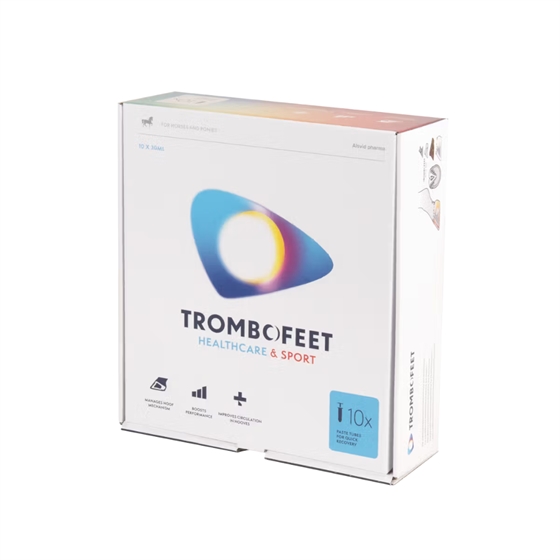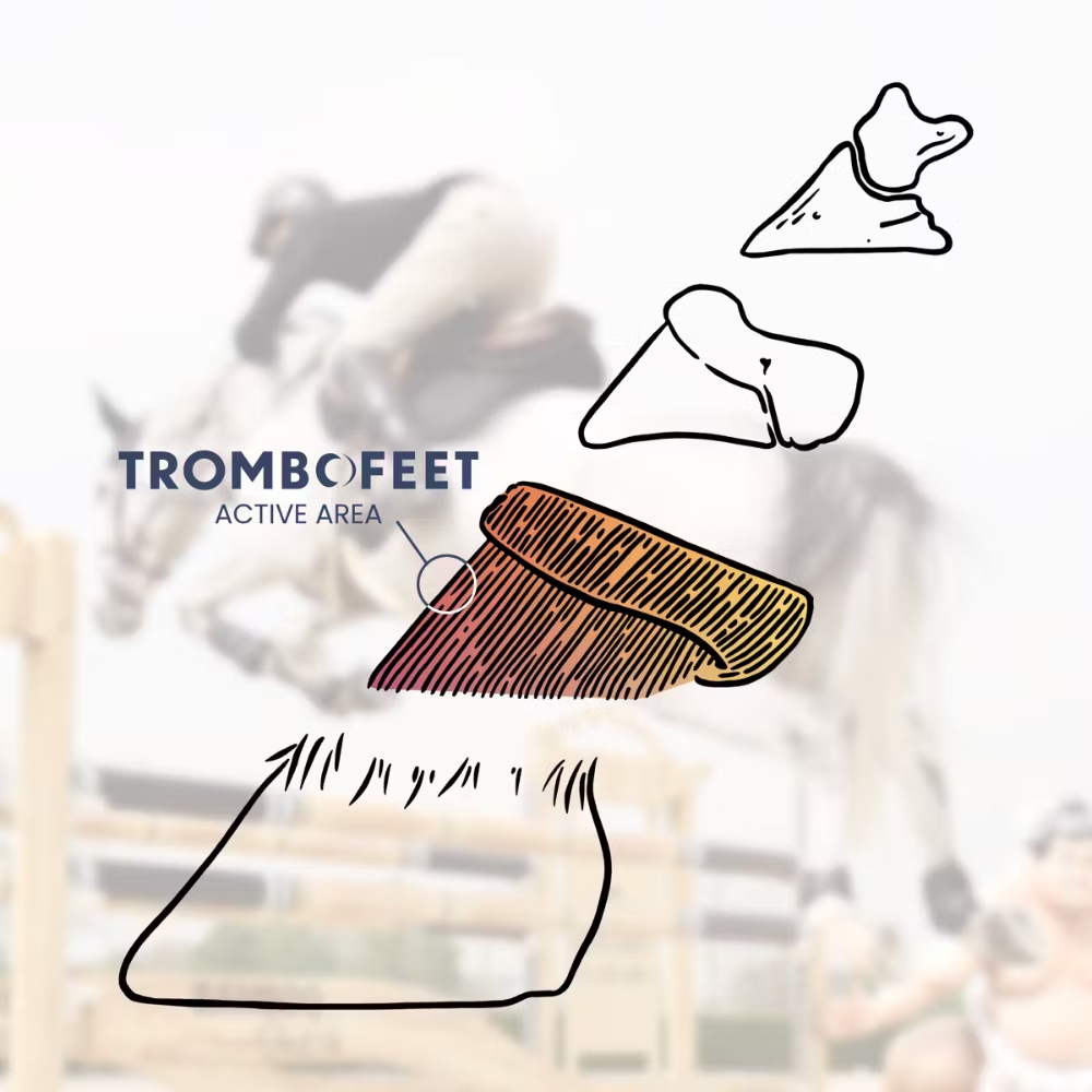 Trombofeet to doustna pasta wspierająca kopyta, opracowana, aby pomagać w utrzymaniu fizjologicznej równowagi kopyta podczas wysiłku. Gdy naczynia krwionośne rozszerzają się w trakcie pracy, ciśnienie w kopycie może wzrosnąć i wpływać na komfort oraz stabilność. Trombofeet pomaga zmniejszyć to "uczucie ciśnienia", wspierając krążenie krwi w kopycie i ogólny komfort przed, w trakcie i po intensywnym treningu lub zawodach.