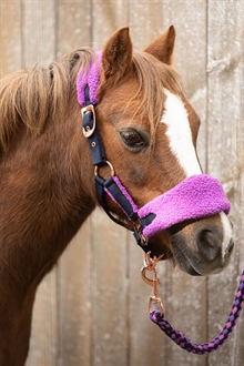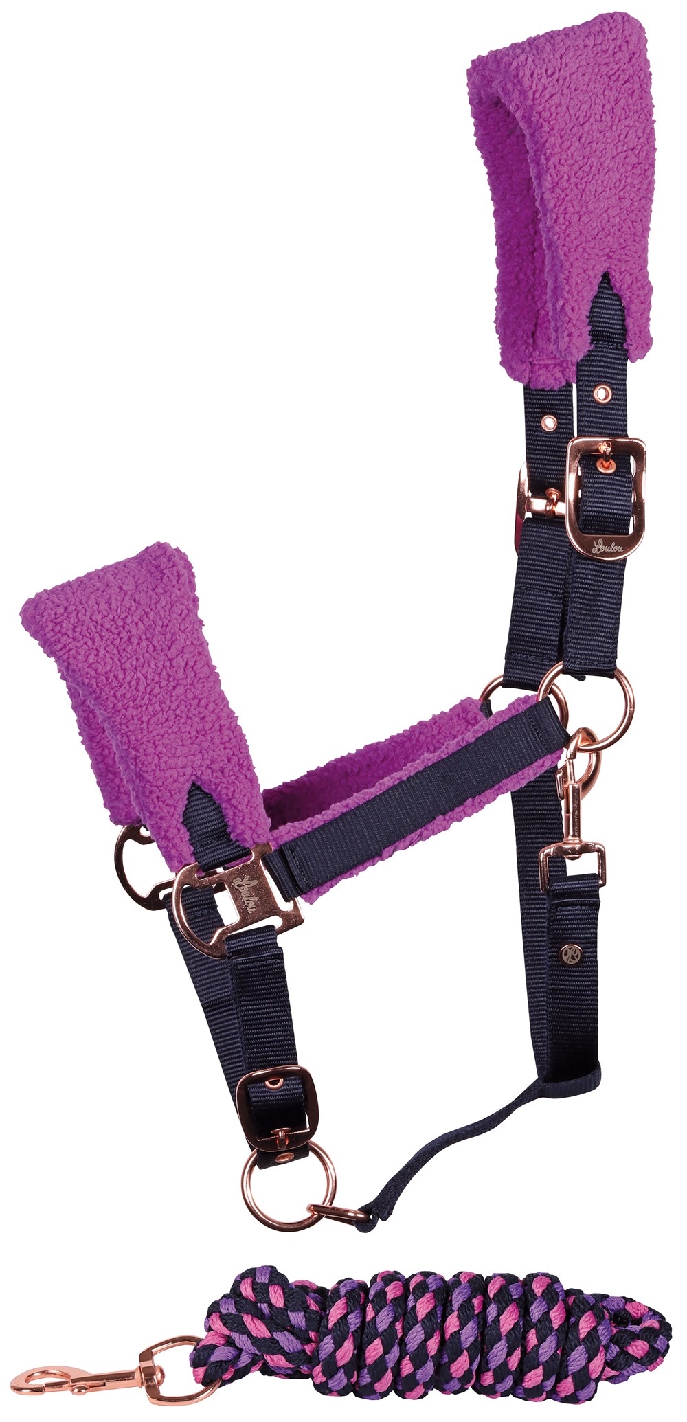Uroczy zestaw kantarów z logo LouLou na różowozłotym okuciu, z nachrapnikiem z polaru oraz policzkami i potylicą podszytymi polarem. Potylica jest regulowana po obu stronach i również regulowana przy nosie. Zawiera 2-metrową linkę do prowadzenia.