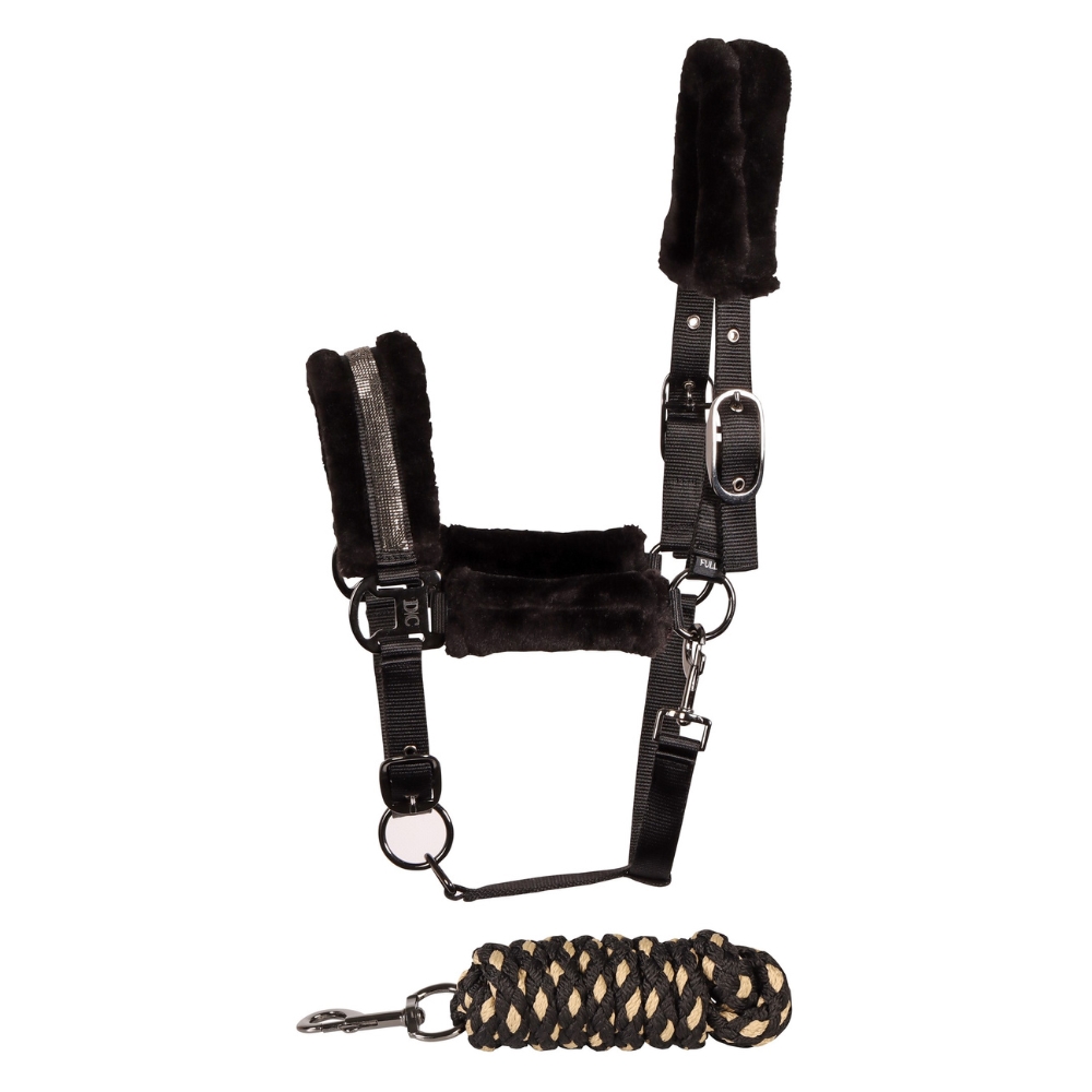 Kantar jest ozdobiony błyszczącymi detalami na nachrapniku i ma miękkie sztuczne futro na nachrapniku, policzkach i potylicy dla maksymalnego komfortu.
