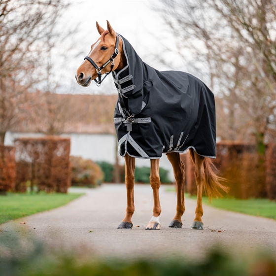 Zintegrowany, stały kołnierz zapewnia pełną ochronę przed warunkami atmosferycznymi i redukuje nacisk na kłąb. To sprawia, że derka jest doskonałym wyborem dla koni, które nie potrzebują odpinanych kołnierzy lub systemu liner.