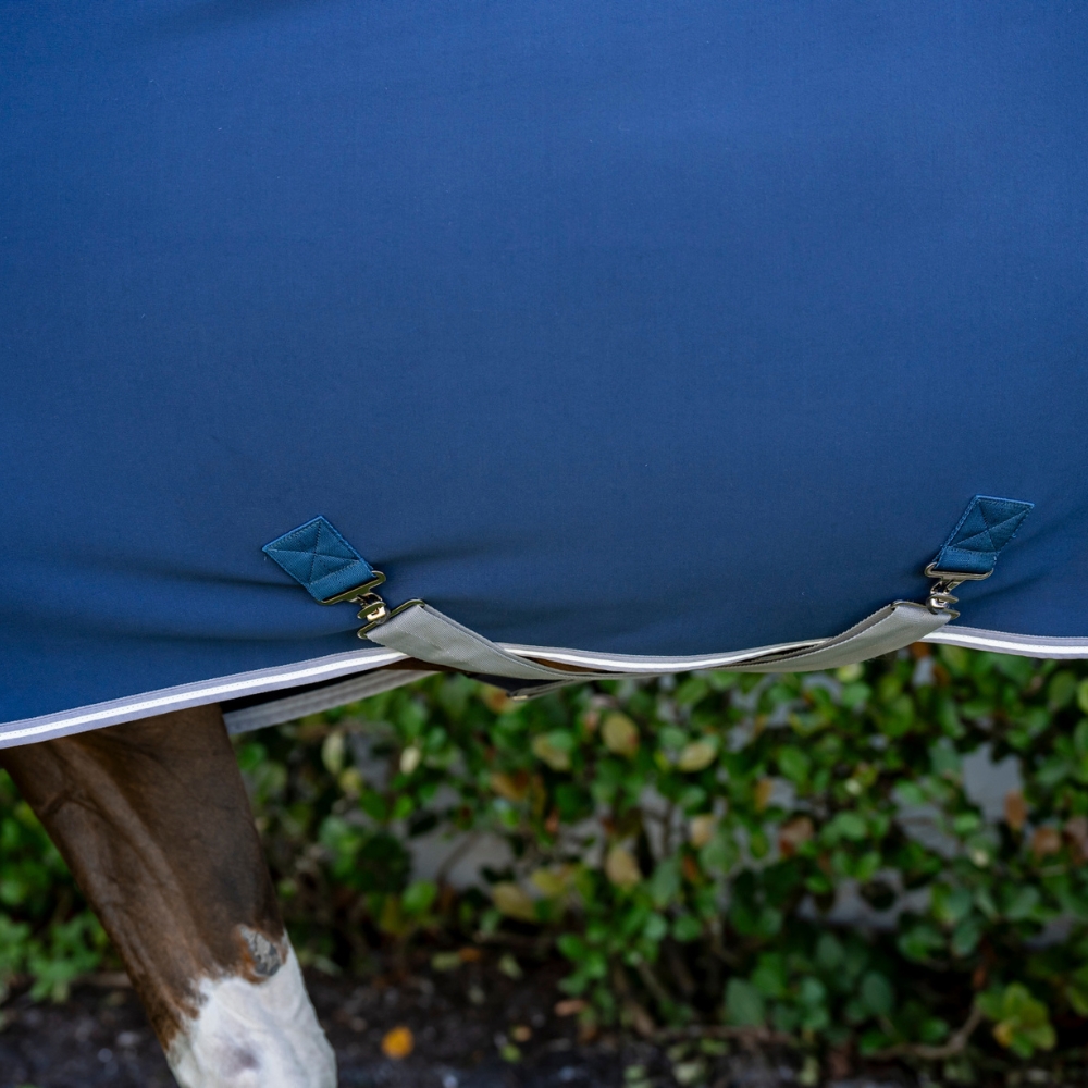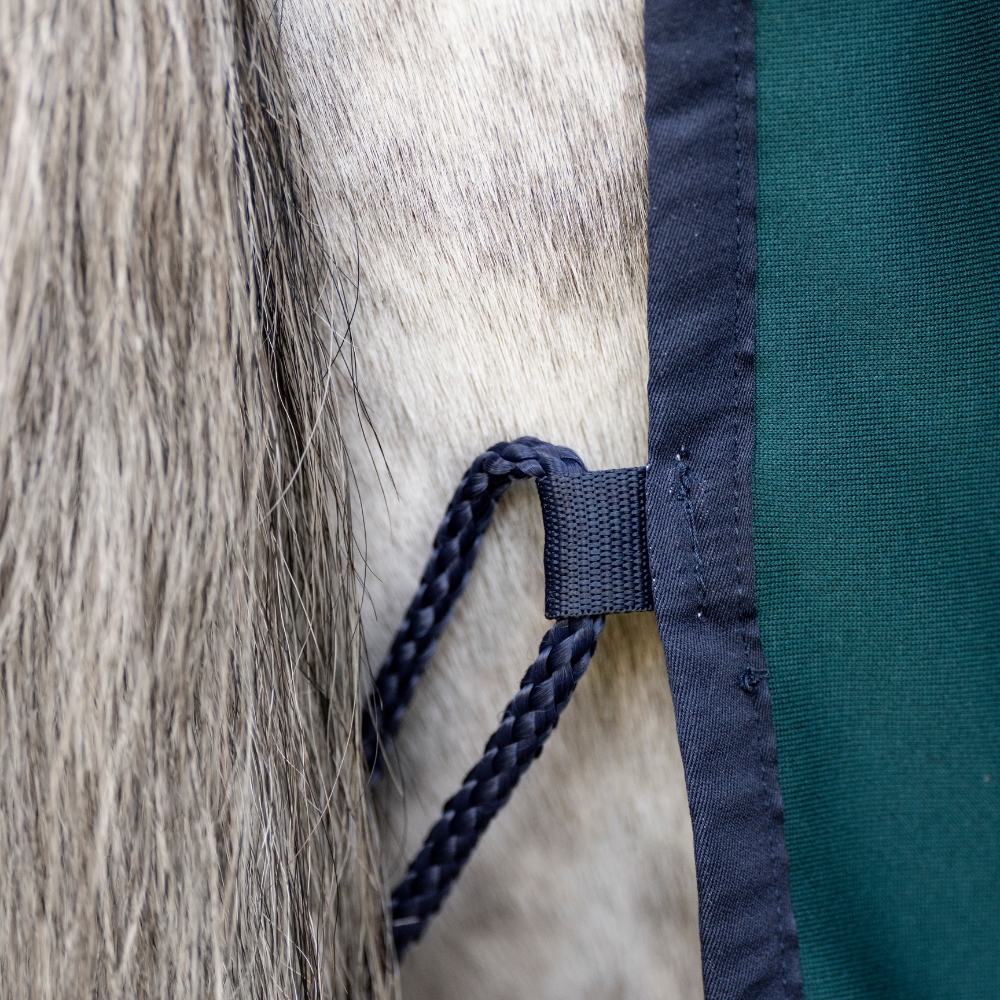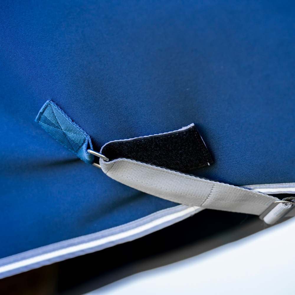 Derka jest wyposażona w bezpieczne zapięcie z przodu, odpinane paski na brzuch i pasek na ogon, co zapewnia elastyczność i ułatwia dopasowanie derki do potrzeb.