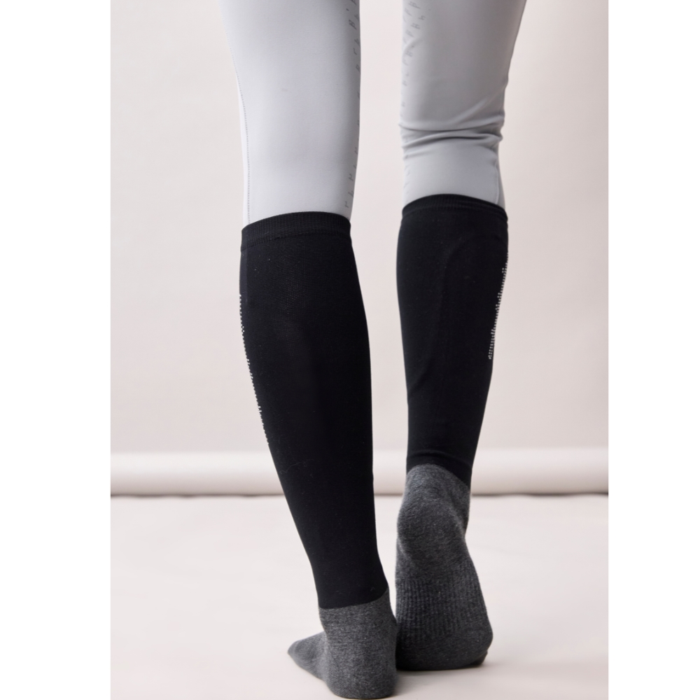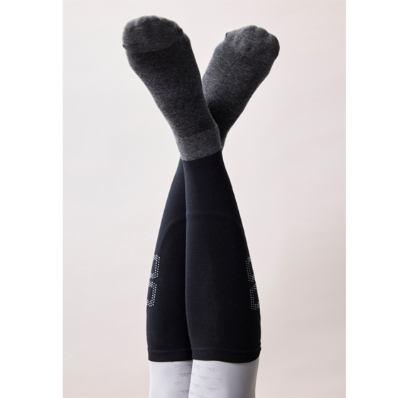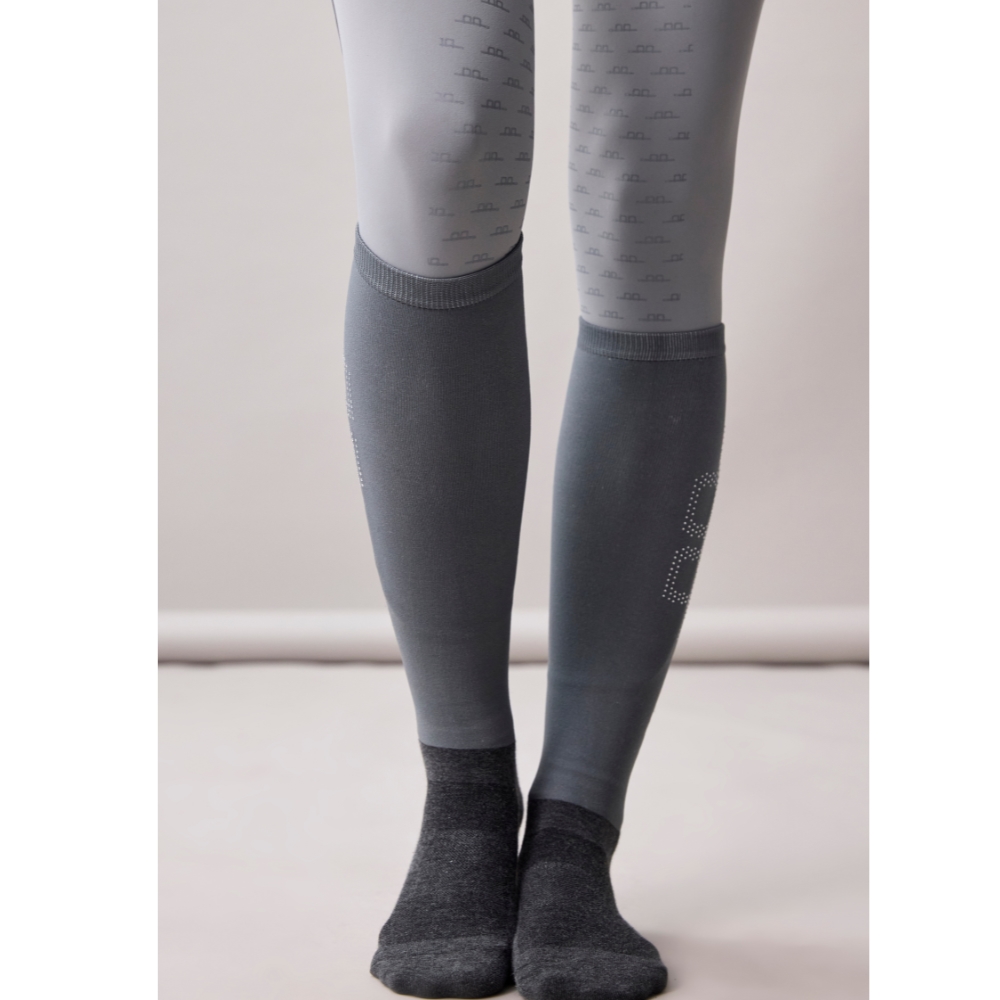 Dopasowana górna część otula łydkę komfortowo i jest pięknie ozdobiona detalami z kryształków, które nadają elegancki i ekskluzywny wygląd. Część stopy wykonana jest z oddychającej i lekkiej bawełny, co zapewnia dobrą wentylację i wysoki komfort – nawet podczas długich jazd konnych.