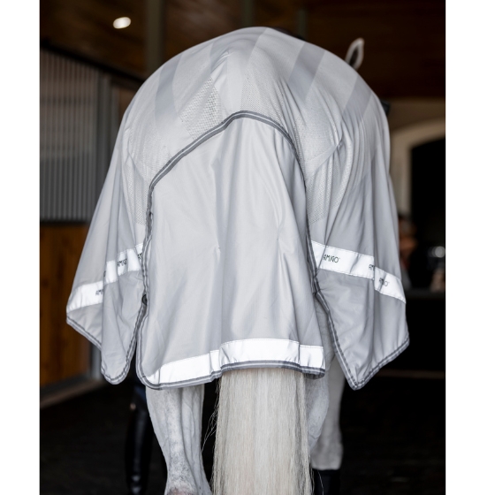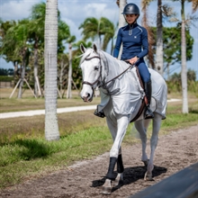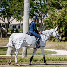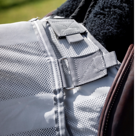 Te lekkie Derki przeciw owadom do jazdy zostały zaprojektowane tak, aby układać się wokół siodła bez wpływu na działanie łydki jeźdźca. Derki dla konia chronią konia od grzbietu po ogon dzięki oddychającemu materiałowi z ochroną UV, który pomaga trzymać muchy i inne owady z dala.
