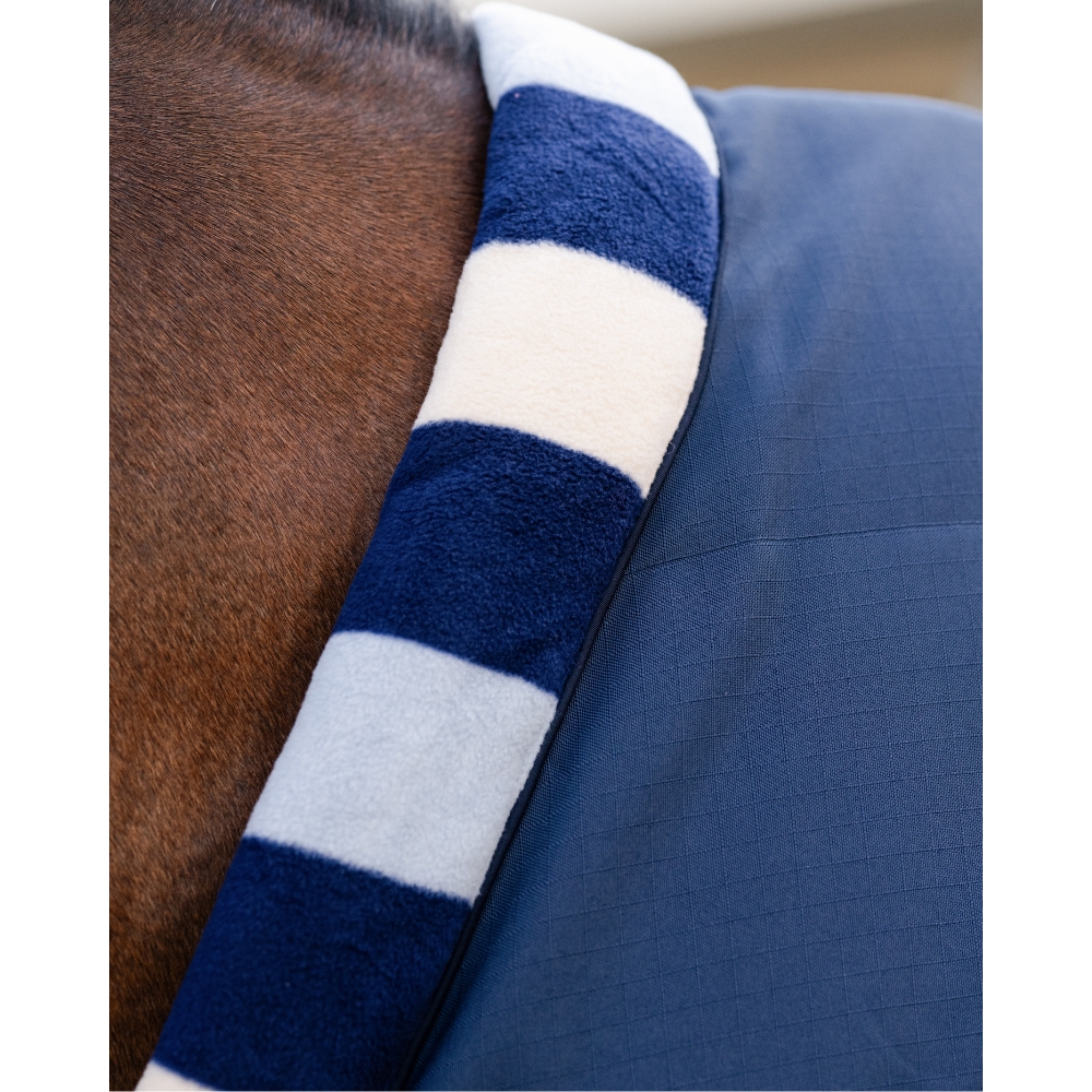 Miękki kołnierz z polaru z klasycznymi paskami Newmarket chroni przed przeciągami wokół szyi i jednocześnie nadaje ekskluzywny wygląd. Zapięcie V-front Horseware zapewnia optymalną swobodę ruchu ramion, dzięki czemu koń może poruszać się naturalnie i bez wysiłku.