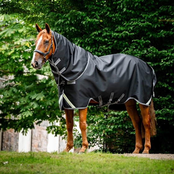 Derka dla konia jest wodoodporna i oddychająca, a jednocześnie ma antystatyczną i antybakteryjną podszewkę z termicznie związanym wypełnieniem.