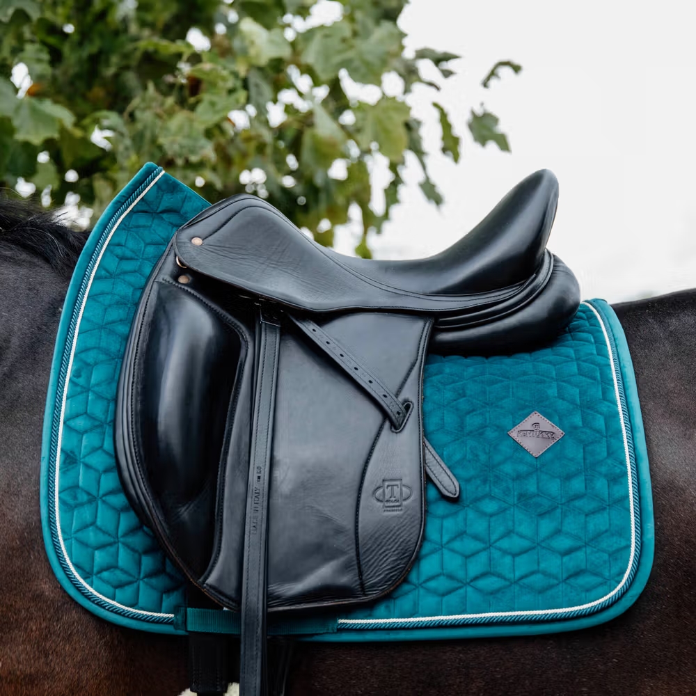 Ekskluzywne czapraki do dressage od Kentucky. Czapraki wykonane są z wspaniałego materiału i mają klasyczny wygląd. Nie mają pasków do przymocowania do siodła, tylko nylonowe paski do utrzymania popręgu na miejscu. Posiadają ładne logo wykonane ze sztucznej skóry, umieszczone wyżej niż zwykle, aby pozostawić miejsce na ewentualne hafty. Czapraki można prać w pralce w temperaturze 30° i nie powinny być suszone w suszarce bębnowej. Dostępne w rozmiarze: Cob Dostępne w kolorze: Wiele kolorów