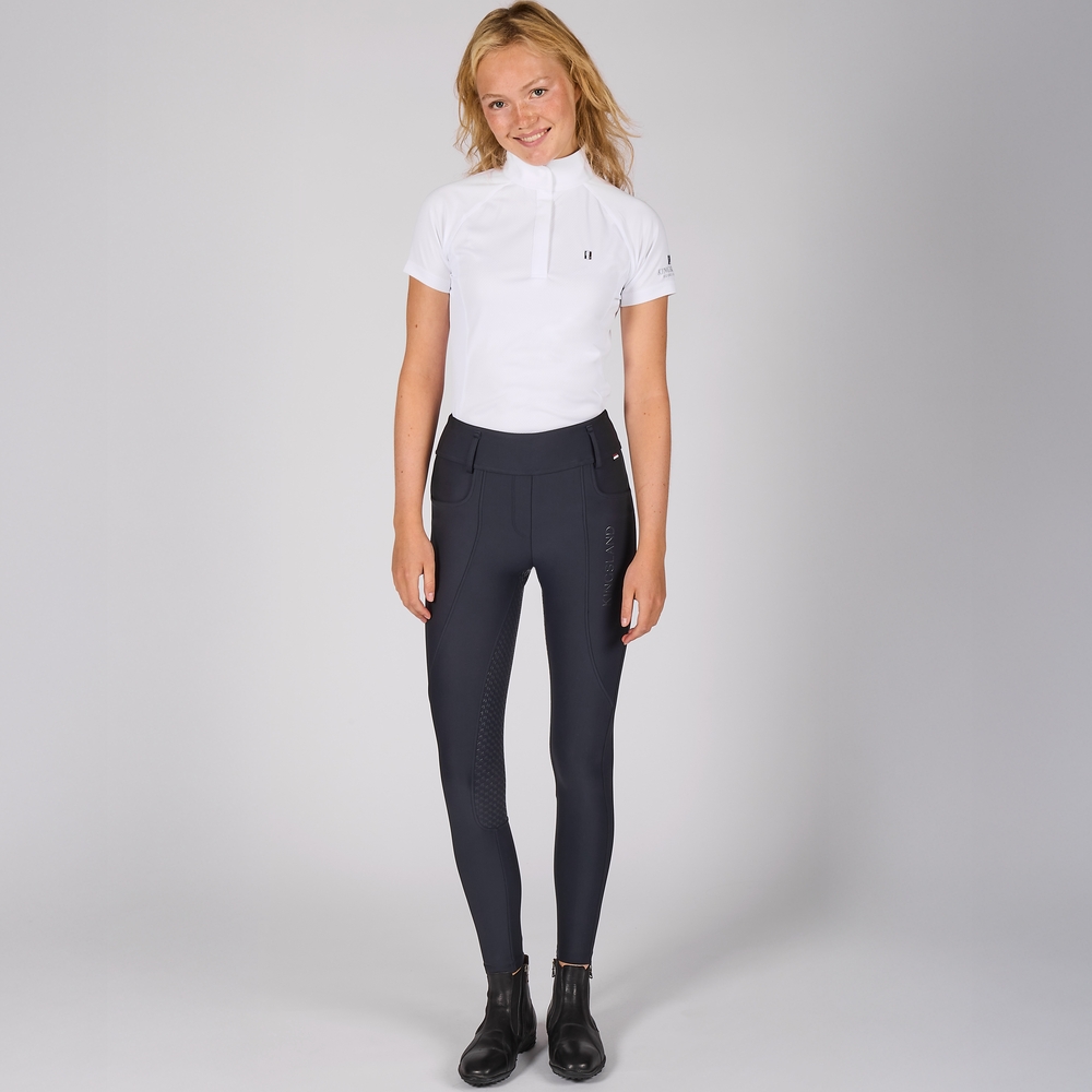 A-kształtne dopasowanie zapewnia optymalną swobodę ruchów i komfort, podczas gdy pełny silikonowy grip zapewnia stabilność w siodle bez ograniczania ruchu. Legginsy doskonale utrzymują formę i są wygodne przez cały dzień – zarówno w siodle, jak i w stajni.