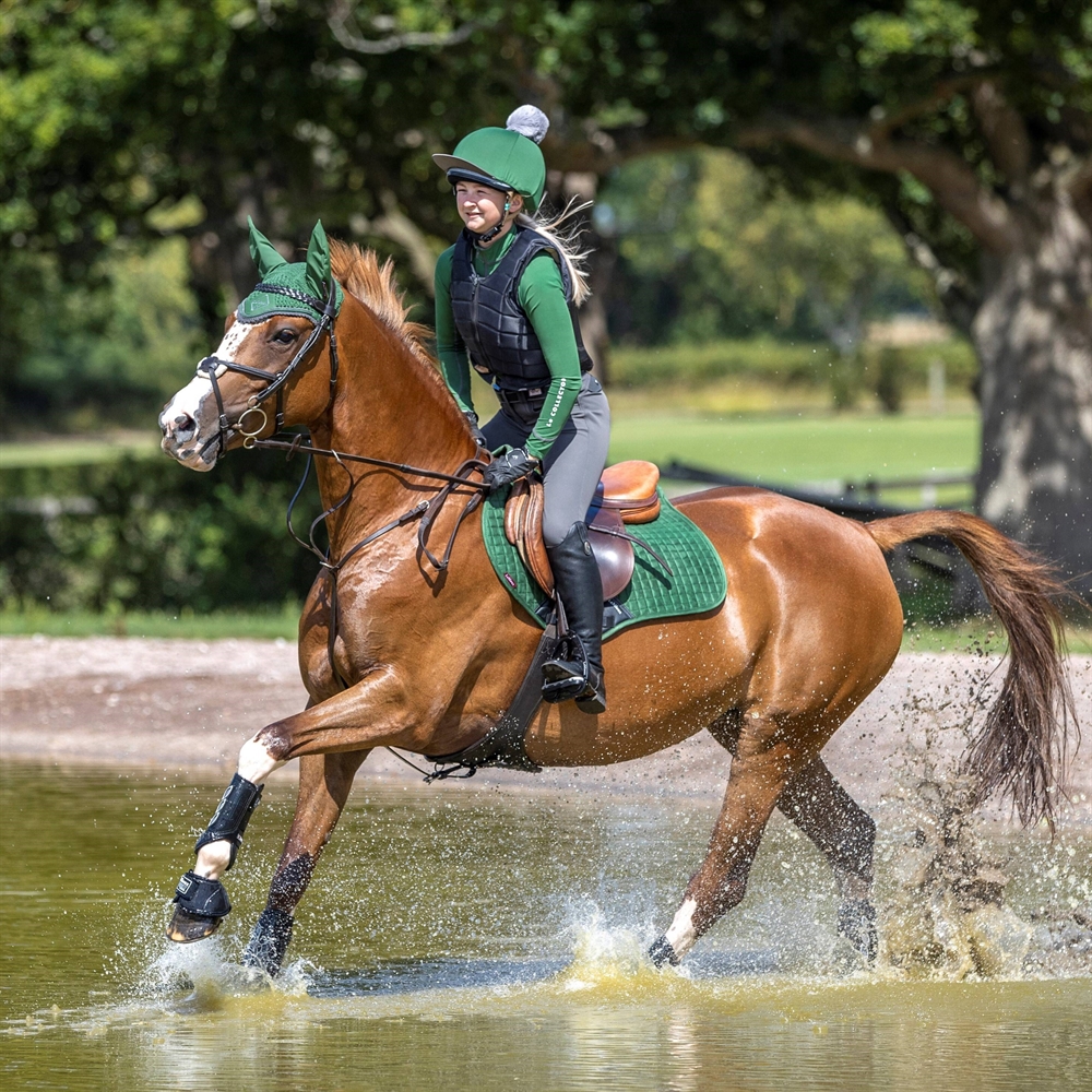 Saddle pad z supermiękką obwódką zamszową i PU-skórą jako ochroną w okolicy popręgu, wyznacza nowe standardy w stylu i komforcie. Ustanowiony jako ikoniczny wygląd LeMieux, gdy jest połączony z pasującymi bandażami polo i kapturkiem na muchy.