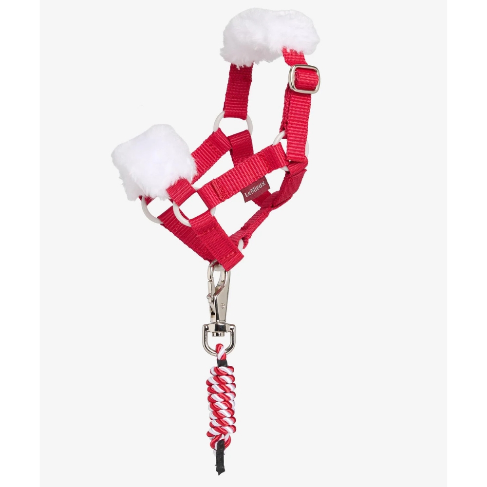 Kantar ma miękką wyściółkę z polaru na nosie i karku, regulowany pasek oraz szczegółowe logo LeMieux. Zestaw jest dostarczany z dopasowanym uwiązem – dokładnie jak prawdziwy produkt.