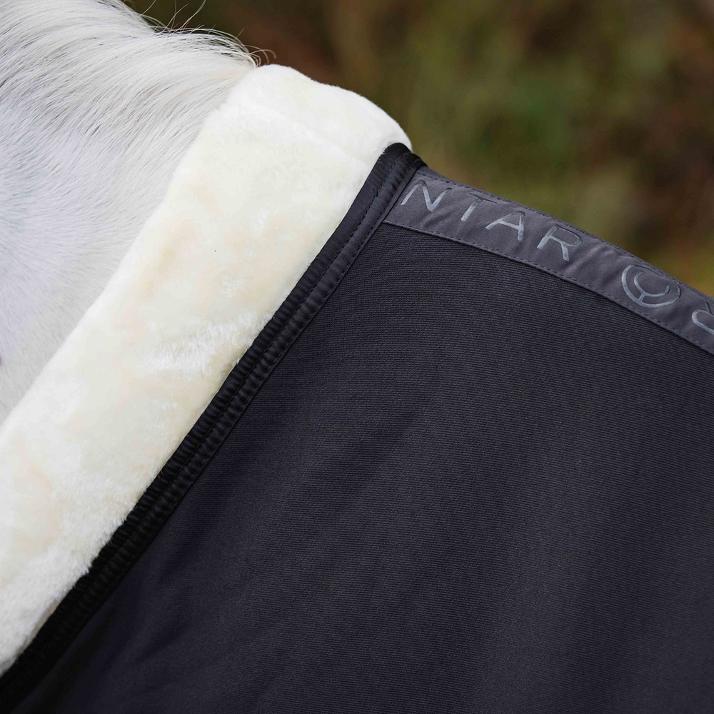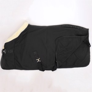 Fleece derki dla konia z satynową taśmą z logo wzdłuż kręgosłupa i sztucznym futerkiem na kołnierzu.