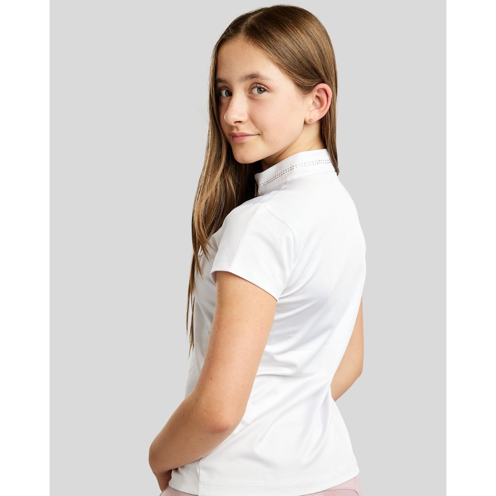 Klasyczny biały kolor w połączeniu z pięknymi, błyszczącymi kamieniami nadaje koszulce elegancki i zatwierdzony na zawody wygląd. Idealna dla młodego jeźdźca, który pragnie odrobiny blasku bez kompromisów w funkcjonalności.