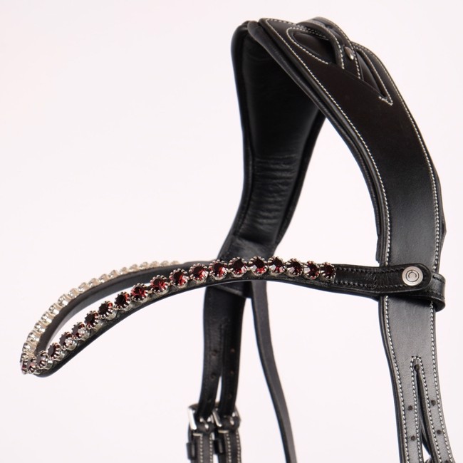 Elegancka skórzana nausznica od Montar z pięknymi błyszczącymi kamieniami. Nausznica jest lekko wygięta i ma zatrzaski po bokach.