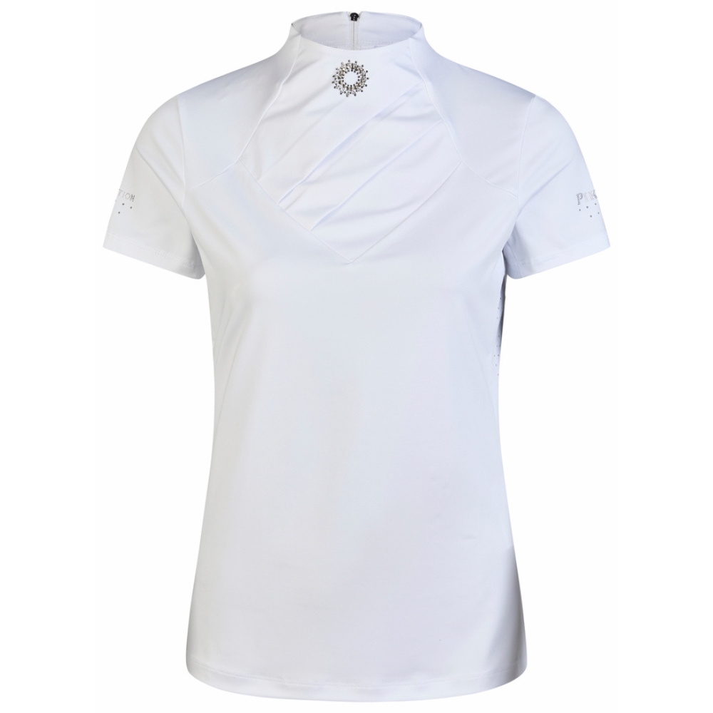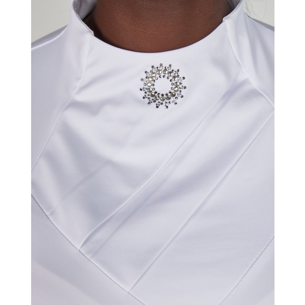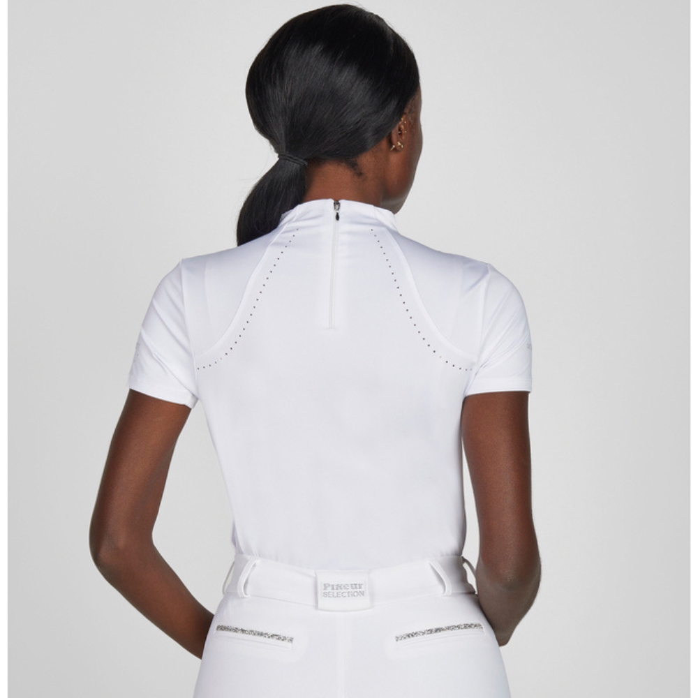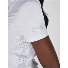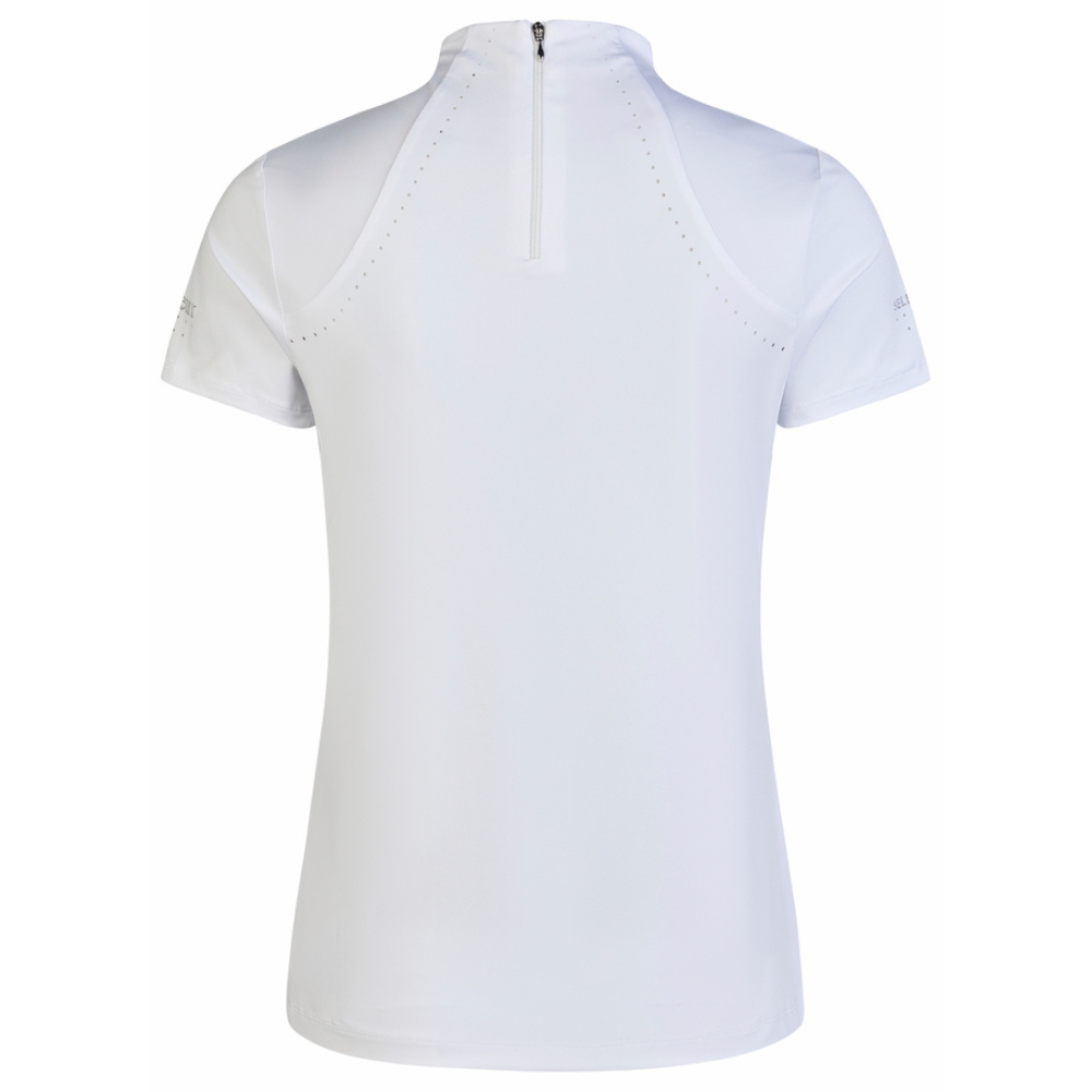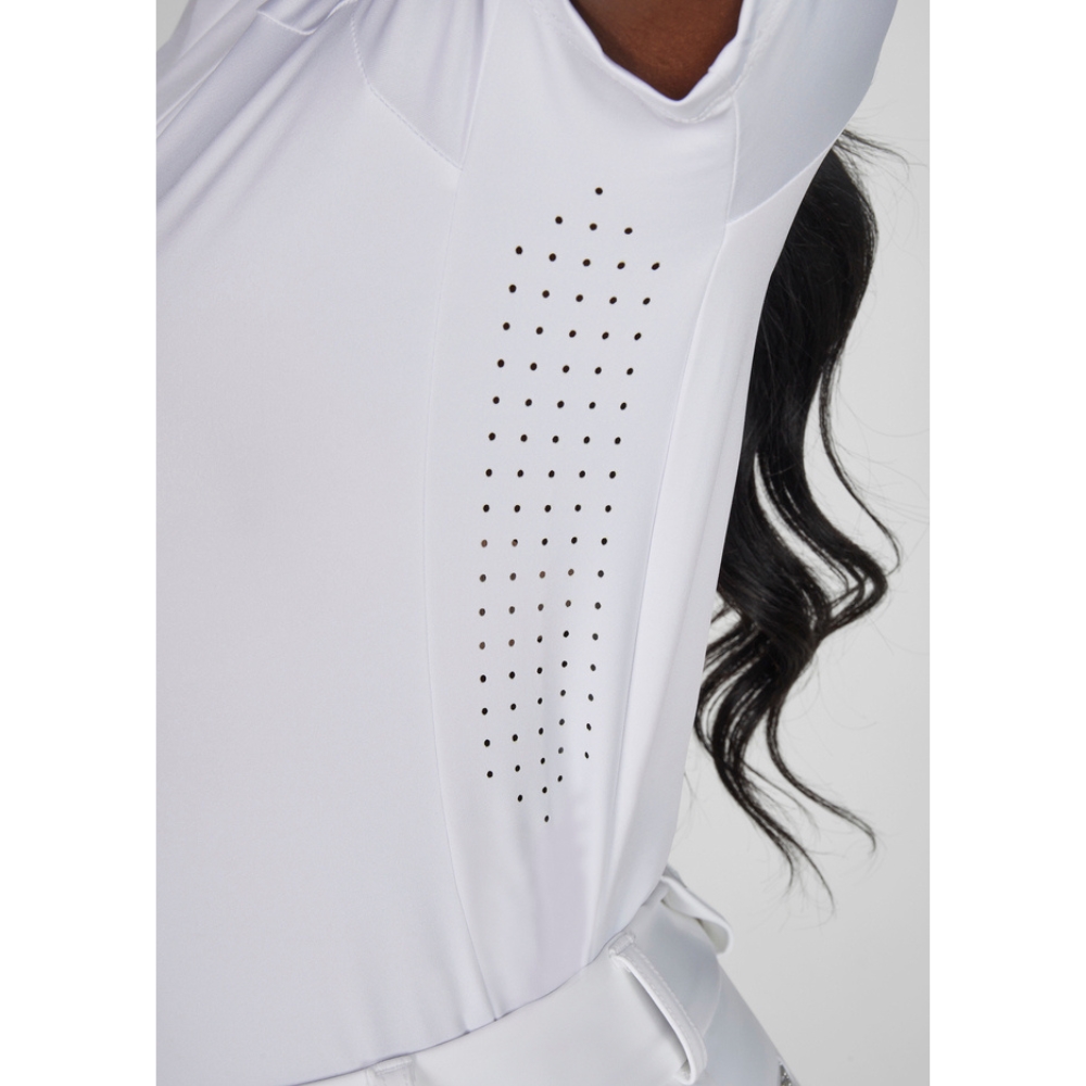 Ta stylowa koszulka konkursowa łączy kobiecy, dopasowany krój z funkcjonalnymi materiałami i pięknymi detalami – idealna dla jeźdźca, który pragnie wyrafinowanego wyglądu na arenie.