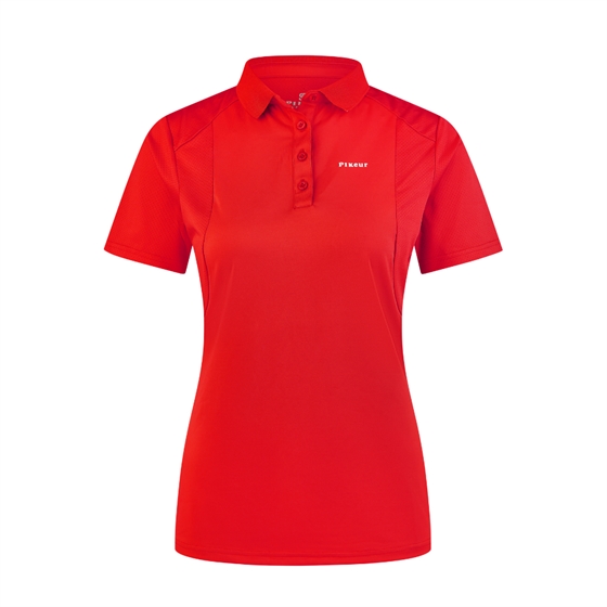 Kołnierzyk polo z guzikami i biała etykieta Pikeur po prawej stronie klatki piersiowej.