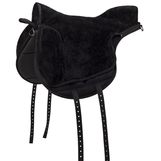 Tył jest wykonany z antypoślizgowej gumy, więc dobrze trzyma się podłoża. Z przodu jest uchwytowy stop. Anatomiczny krój z miejscem na kłąb. 2 długie paski na każdej stronie. Wierzch ze sztucznego futra, który można odpiąć za pomocą zamka błyskawicznego, jeśli chcesz jeździć bez niego lub gdy trzeba go umyć. D-ringi ze stali nierdzewnej zarówno z przodu, jak i z tyłu.