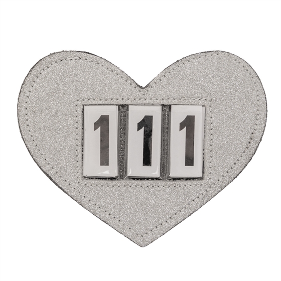 Numer startowy w kształcie serca z dyskretnym brokatem.