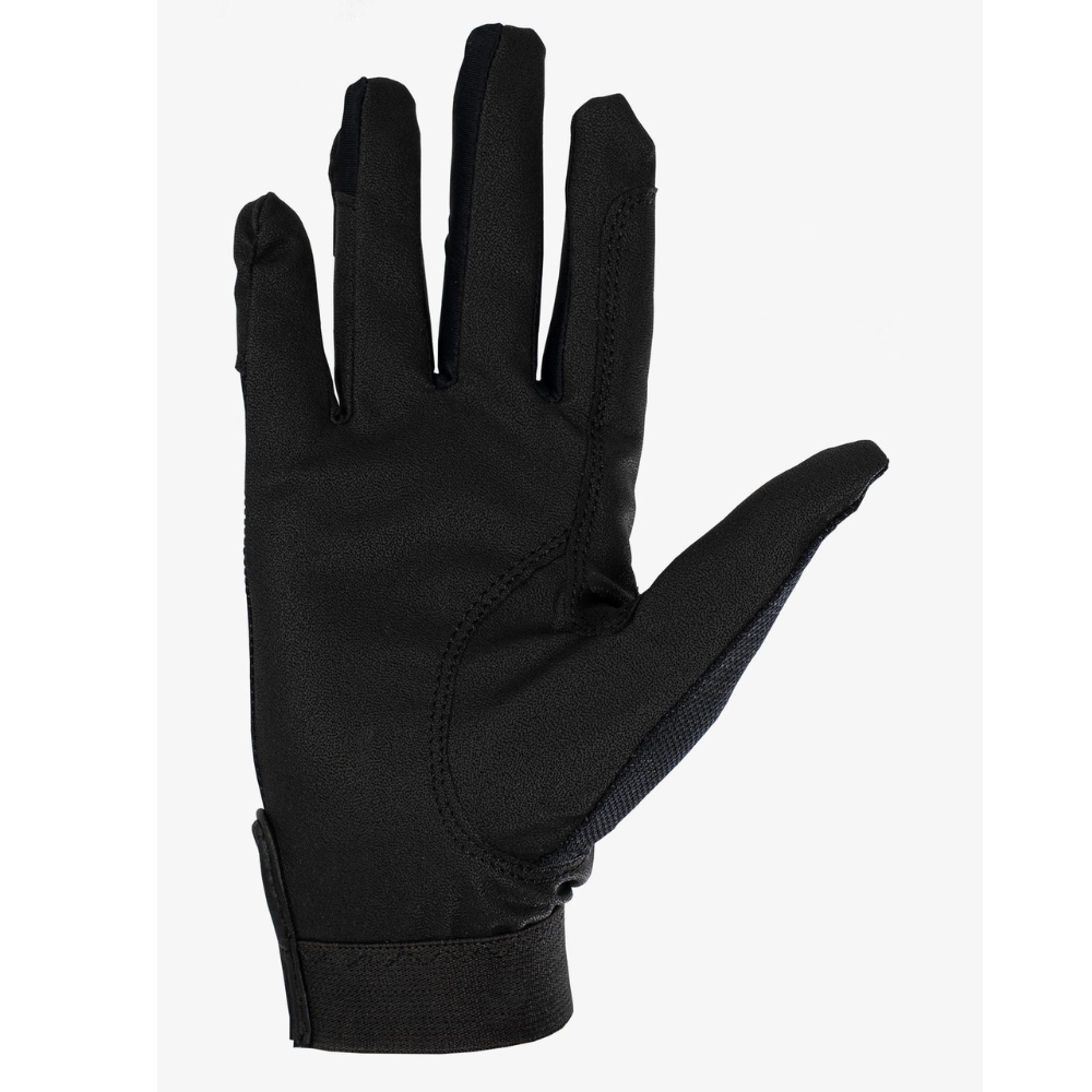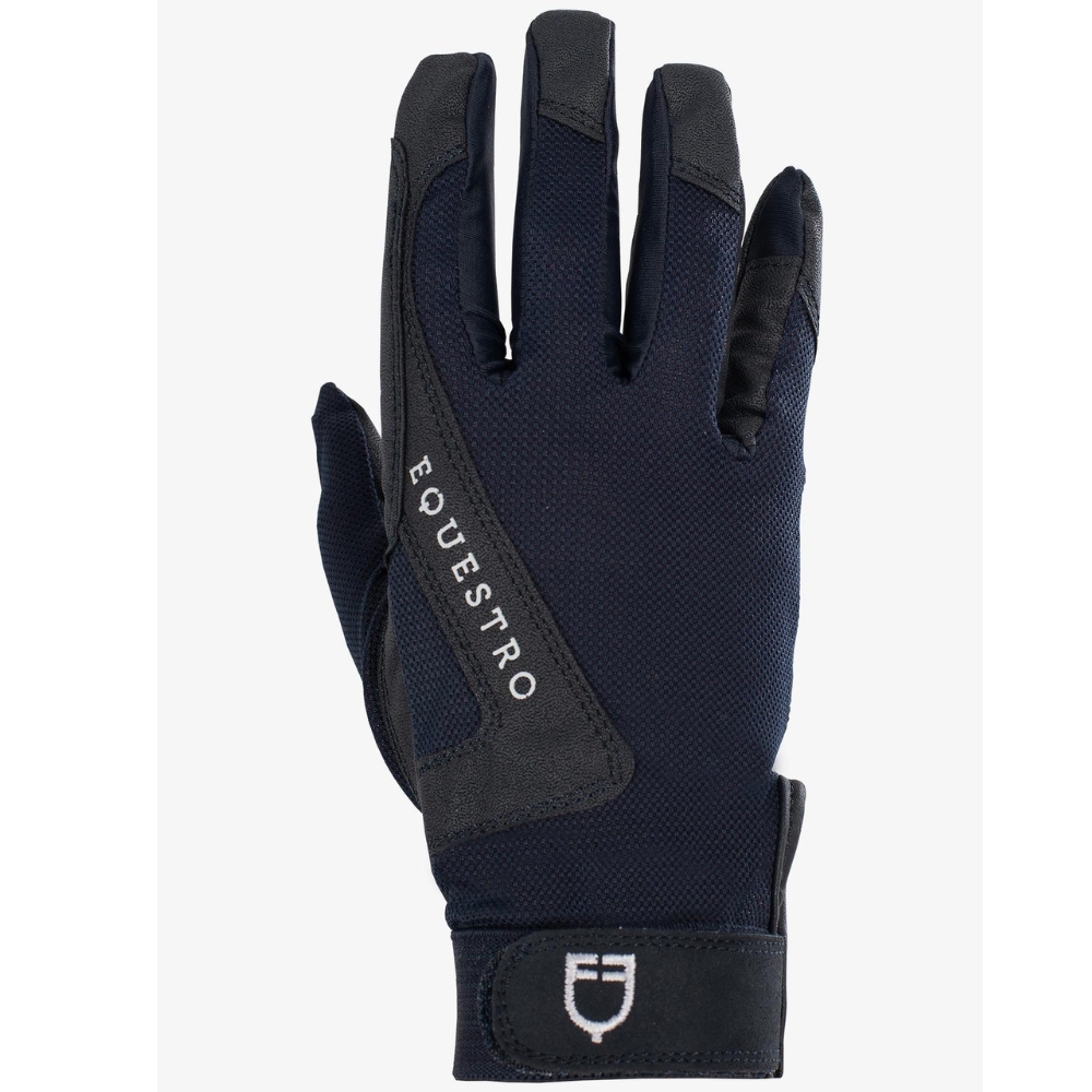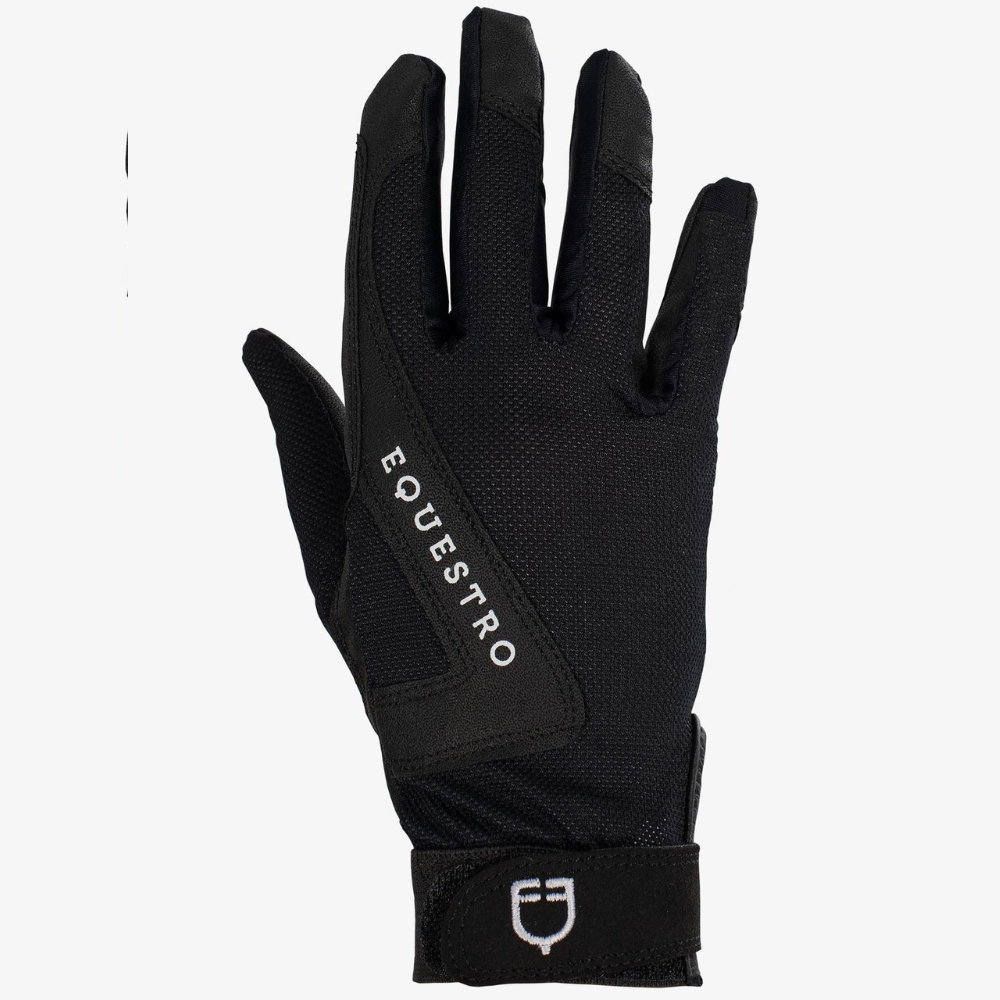 Tył i zapięcie z poliestru są ozdobione logo i tekstem Equestro, co nadaje rękawiczkom sportowy i nowoczesny wygląd.