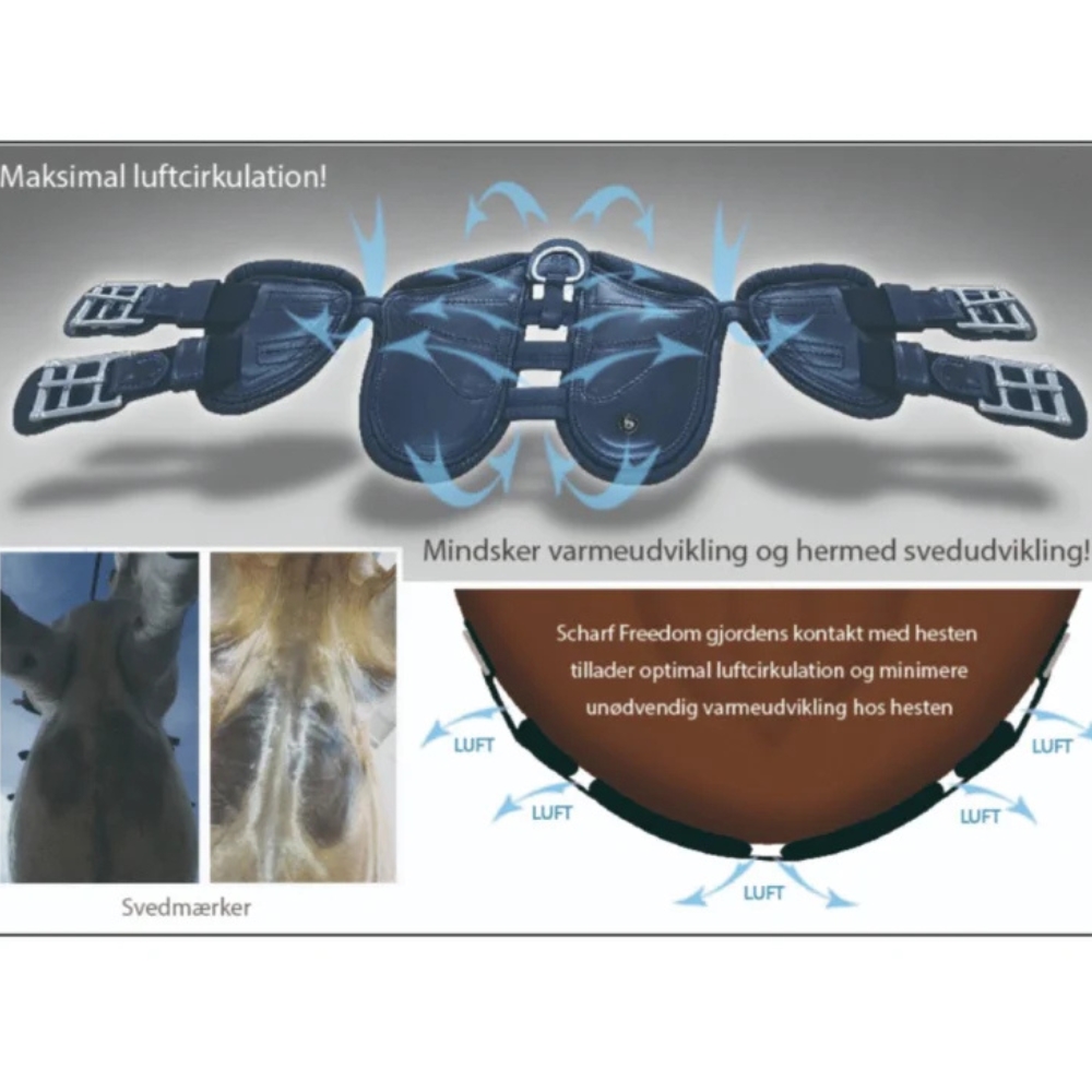Scharf Freedom jest jedynym popręgiem na rynku, który jest w 100% elastyczny i ruchomy we wszystkich połączeniach. Innowacyjna konstrukcja oznacza również mniej punktów kontaktowych, co daje koniowi lepszą możliwość odprowadzania potu w miejscu popręgu. Popręg jest lekki i praktyczny na co dzień i można go łatwo złożyć.